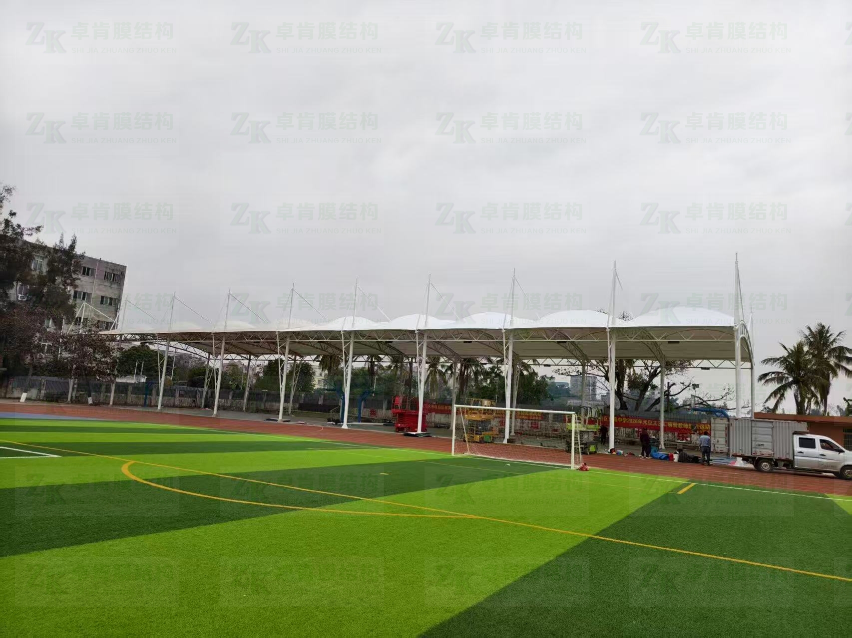 在现代运动场中,膜结构篮球场以其新颖的结构形式成为学校运动场建设的亮点,它凭借自身优势适配多种样式场地。它能有效抵御风雨日晒,为运动者营造安全稳定的运动环境。膜结构篮球场的结构不仅具备优异的功能性,还拥有独特的美学价值。