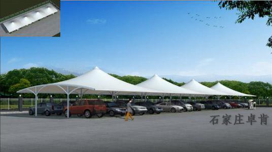 1、 轻质:张力结构自重小的原因在于它依靠预应力形态而非材料来保持结构的稳定性。从而使其自重比传统建筑结构的小得多,但却具有良好的稳定性。建筑师可以利用其轻质大跨的特点设计和组织结构细部构件,将其轻盈和稳定的结构特性有机地统yi起来。膜结构车棚