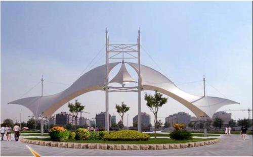 而景观设计要求其具有广泛的可读性、雅俗共赏,既有超凡脱俗的艺术价值,又能使大众喜闻乐见与大众息息相通。膜结构以其轻盈飘逸的造型、柔美并带有力量的曲线和大跨度和大空间的鲜明个性和标识性,应用于城市小品设计中。
